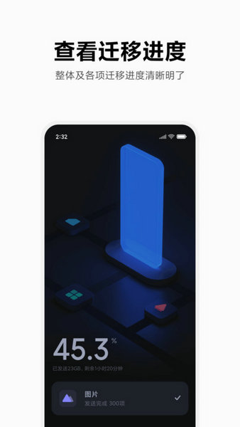 1.新旧手机都可以开始互传数据,操作简单,爸爸妈妈都会用!
