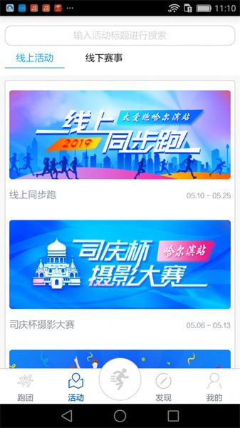 可记录跑步步数、团体PK等趣味模块,整合线上线下活动,举办线上及其他专业活动。在健康跑步的基础上,通过主题活动和体育赛事来提高用户的运动兴趣和健康。可以参加的活动有很多,只要参与,就会有奖励。