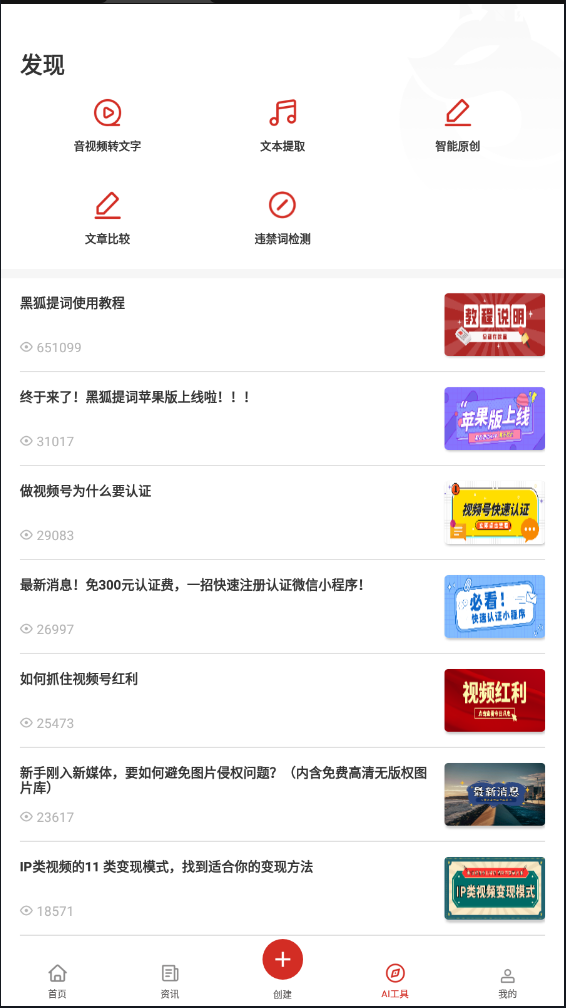 4.新增实用AI工具辅助,将音频视频转换为文本,从pdf、word、txt文档中提取文本,自动重新原创文章,检测违禁词等。