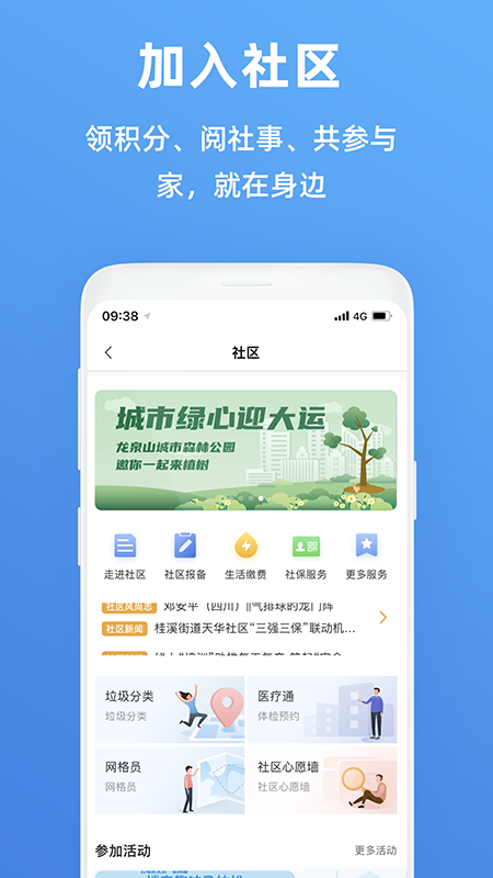 4、公民可以通过应用了解社区提供的服务,查询与社区相关的社区活动,并在应用中投诉违法建设、私占公共土地等情况。