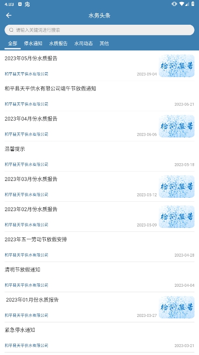 一键直接接入当地自来水公司客服热线,在线查看水质检测报告、业务指南等相关功能