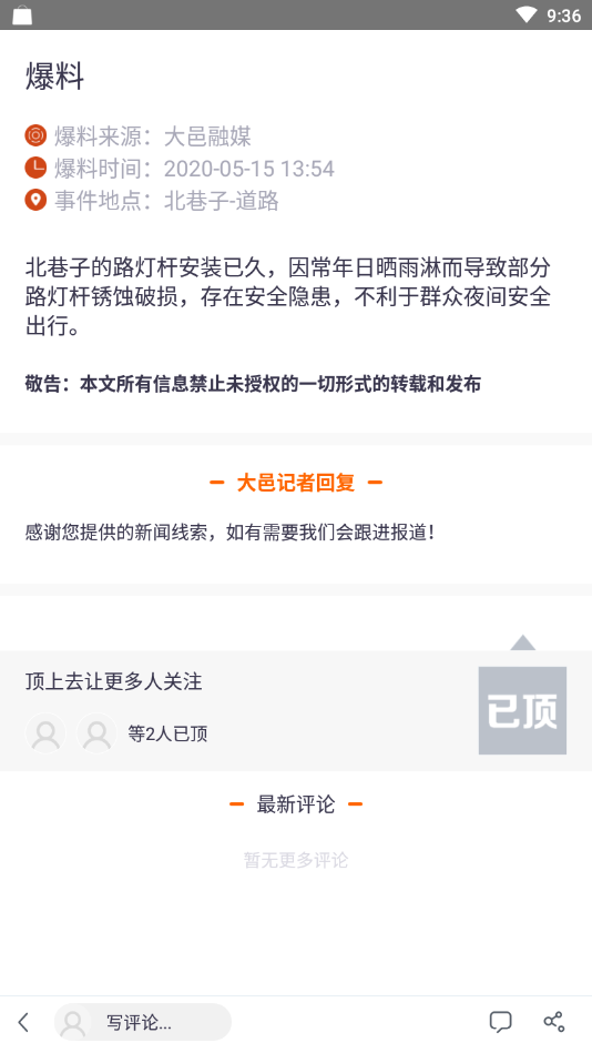 大易传媒平台内容以时事民生为主,新闻内容多为视频形式。
