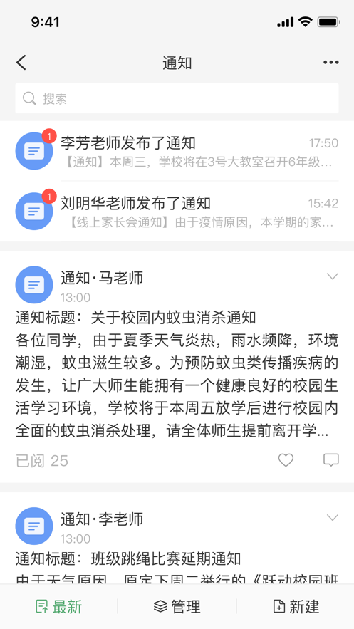 智能通讯录清晰显示学校班级、老师、家长信息,随时随地更新信息;支持智能搜索号码和姓名拼音、一键通话、短信、微信实时聊天。