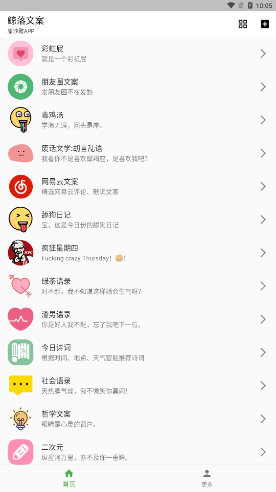 京罗文案(app.shadiao.jingluo)是社会达人必备的文案生成软件。你可以尝试用这个软件生成各类主题的文案,让你在交谈的过程中内容更加饱满。个性和文学才华。