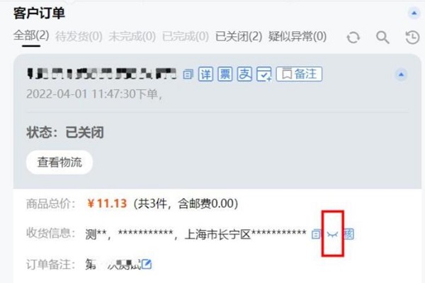 2、点击订单后,可以在图标位置查看客户信息。你需要点击“小眼睛”按钮来展开它,否则它会被隐藏。