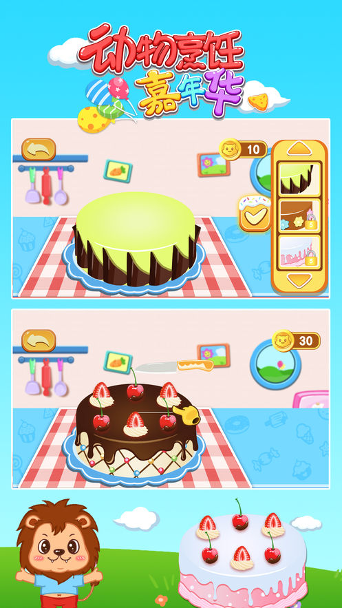 可爱的动物——小狐狸、小猴子、小狮子、企鹅老师等等,它们有很多喜欢的食物。为他们制作食物,以获得他们的赞誉和金币奖励;