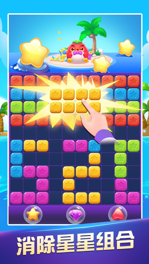 多种消除模式,不同的消除玩法。关卡中会出现特殊的星星。单击可消除相同颜色的方块、十字或星星。