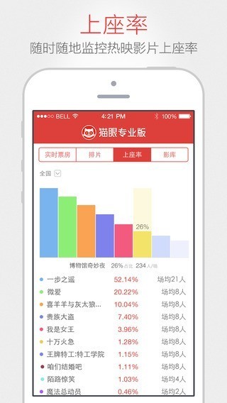 2.随时随地查看热门电影上座率,国内最先进的放映查询工具,随时了解所有电影;