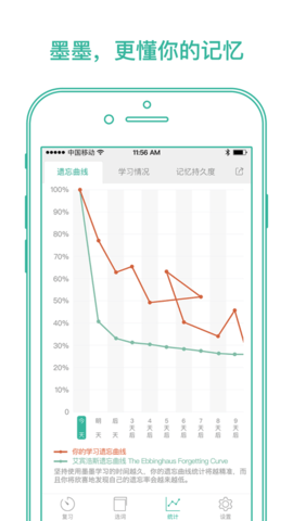 3、软件中有一条曲线叫遗忘曲线,记录你经常忘记的单词,让你更有针对性地完成记忆增强。