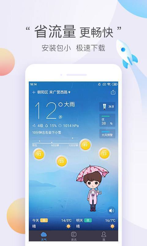 天气预报最重要的是要准确。免费下载安装墨迹天气手机版可精准到街。天气预报基本上说下雨就下雨。