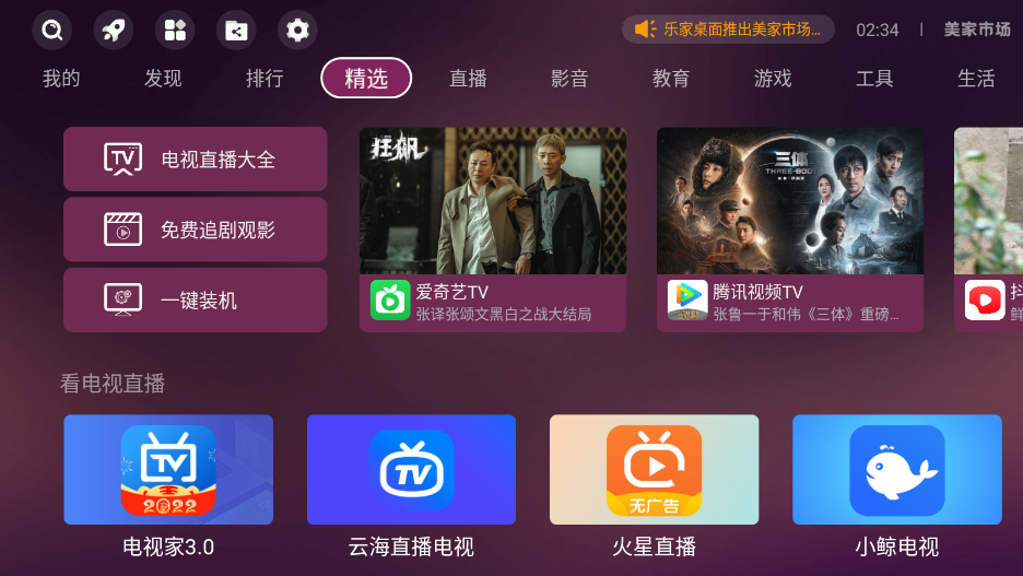 快速稳定的精彩视频,集成爱奇艺电视、优酷电视、腾讯视频等热门软件。