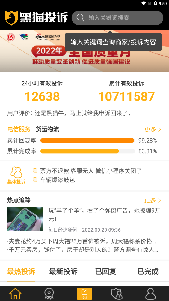 黑猫投诉(com.sina.heimao)是新浪官方打造的消费者权益保护服务平台。您可以尝试通过该平台进行投诉,维护自己的权益。官方将为您提供最全面的服务,解决您的问题。