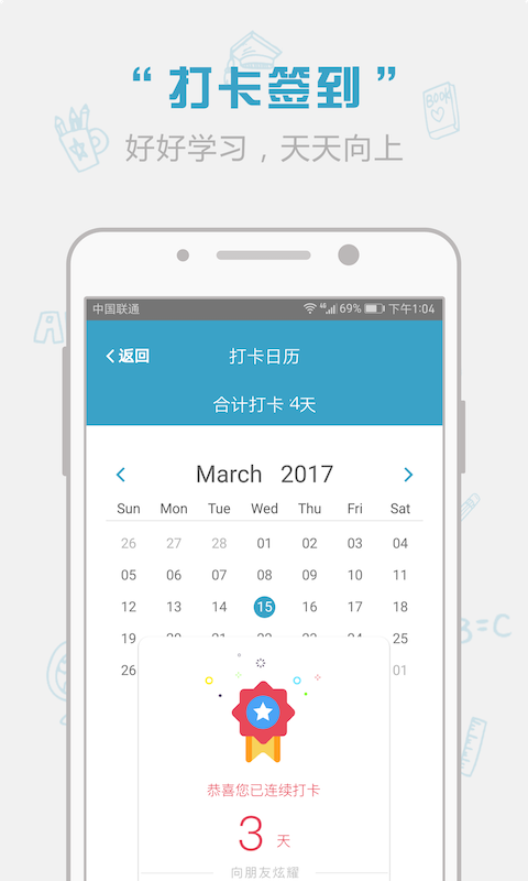 3、签到日历:每天签到,记录学习进度,通过签到督促用户坚持学习。