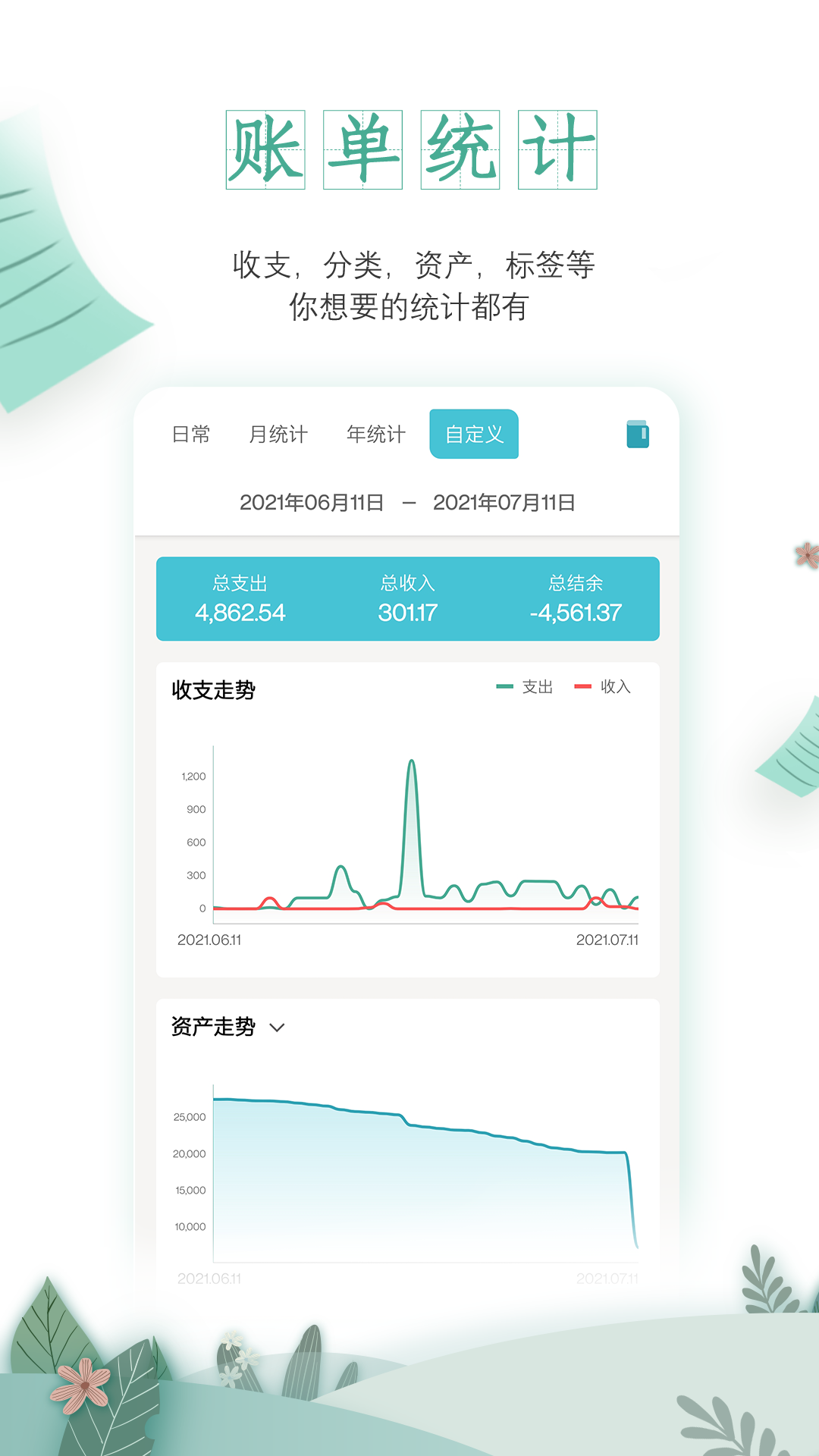 3、数据统计:自动生成详细的收入支出统计报告,让用户更好地了解自己的个人财务状况。