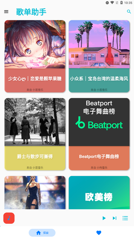 歌单助手(com.buyaobusuo.songlist_helper)是一款免费的音乐软件,以歌曲列表的形式展示各种音乐内容。用户可以根据自己的喜好选择不同类型的播放列表,轻松发现和聆听自己喜欢的音乐。