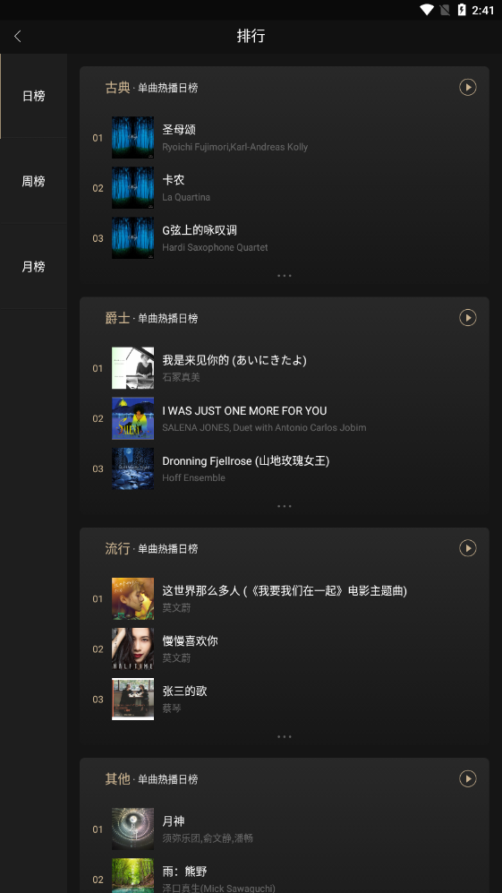 7.排行榜:古典、爵士、流行单曲每日、每周、每月排名
