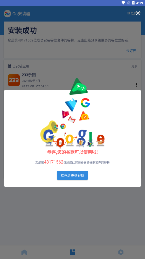 您可以将这个软件分享给谷歌爱好者,让更多的人使用这个应用程序。相信喜欢使用Google Play的人都会欣赏实用的Google安装服务。