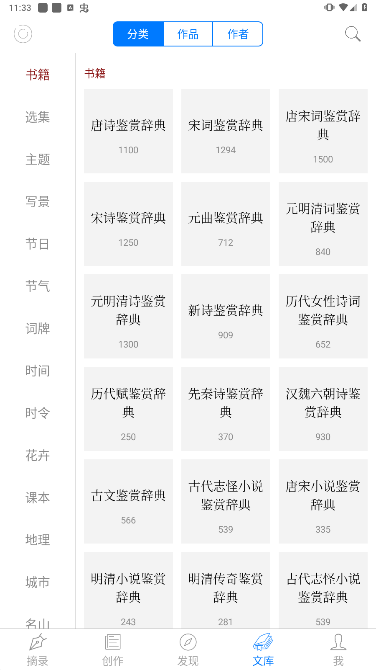 【精选分类】对100万首诗词进行分类,包括:选段、题材、风景、节日、节气、书法板块、季节、教材等。