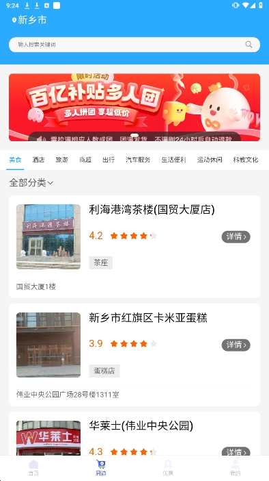 搜索文化、体育、教育、医疗等公共资源,涵盖学校、社区卫生机构、文体场馆等。