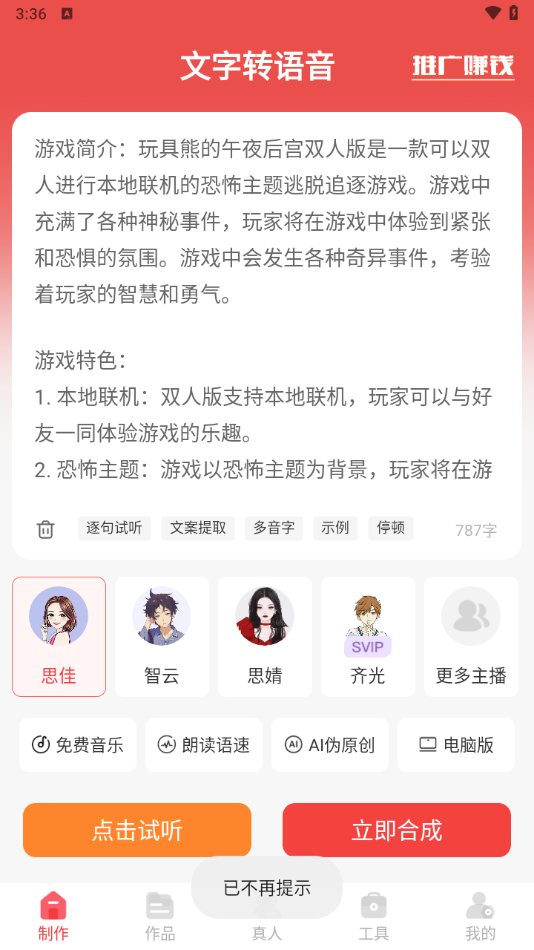 1.高质量语音合成:采用先进的语音合成技术,提供清晰自然的语音效果。