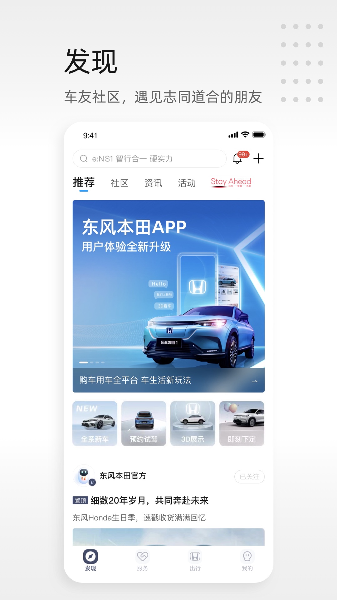 东风本田品牌官方应用App是一款集品牌信息、汽车服务、网上商城、车主社区等功能于一体的综合性软件。旨在为东风本田车主和汽车爱好者提供全方位的用车服务和丰富的一站式内容。