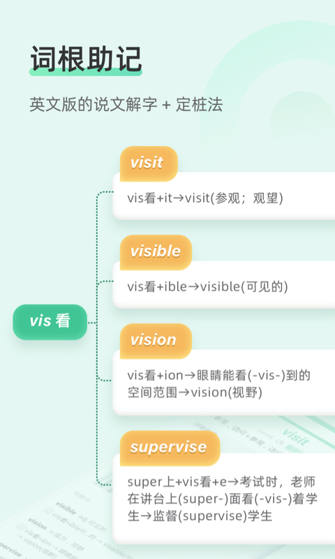1. 提供七种助记法:近助记符、词根助记符、词缀推导、复合词、联想记忆、谐音记忆、图片记忆。选择更好的方法来帮助您记住每个单词。