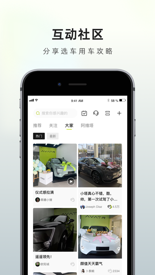 Avita是一款专为新能源车主打造的智能手机应用,提供丰富的户外互动项目和社交功能。通过这款应用,用户可以分享自己的动态、查看健康课程、在线学习如何使用健身器材、选择适合自己的健身课程。此外,Avita APP还根据新能源汽车的特点提供车联网功能,帮助用户更好地管理和使用车辆。