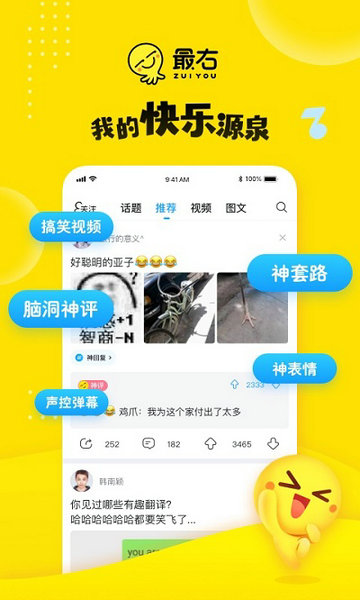 最右下载最新版本app是一款年轻人使用的短视频软件。下载右侧应用程序的最新版本。精彩新热点内容不断更新。平台会根据用户的兴趣爱好,实时推荐你感兴趣的内容,基于大数据的个性化推荐引擎,与懂行的人互动,结交志同道合的朋友,超有趣的社区福利。这里有最经典的独家评论,每条评论都能让你开怀大笑,还有个性化的实时推荐、精彩的热点帖子和神回复。