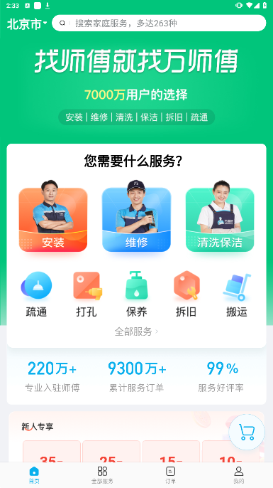 万师傅是一款旨在为家庭及个人用户提供上门安装、上门维修、管道疏通、家电清洗、家居保洁、甲醛检测等便捷家居生活服务的应用软件、家具和电器搬运以及货物运输。等等,有保障、按需服务,解决您生活中的小问题。