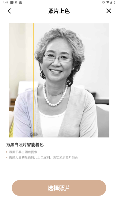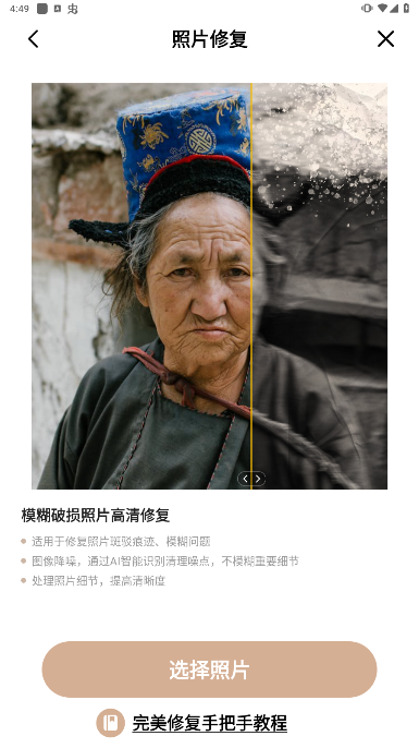 支持图像修复和复原功能,如老照片修复、老照片修复、图像修复、黑白着色和图像恢复。您可以一键将模糊照片、模糊老照片恢复颜色、恢复老照片、恢复视频截图。