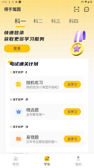 德手驾园是专门为学车、练车、考驾照的学员打造的学习服务软件。该软件全面涵盖了从科目一到科目四的所有内容,包括科目一和科目四的理论知识,以及科目二和科目三的实践技能。不仅提供丰富的理论知识,还拥有独特的教研体系,包括科目二和科目三的视频教学,为学生提供全面的讲解,帮助他们更好地掌握驾驶技能。