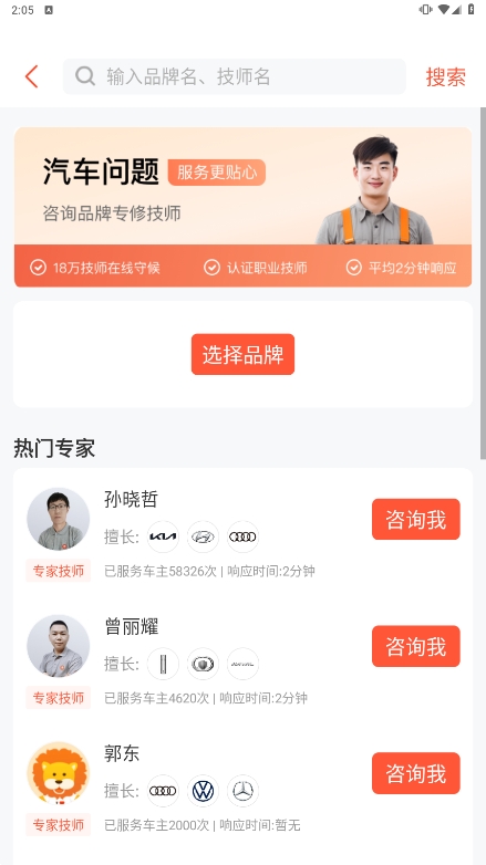 覆盖100多个汽车品牌,每个品牌都有专业的汽车技师在线解答问题,让车主放心。