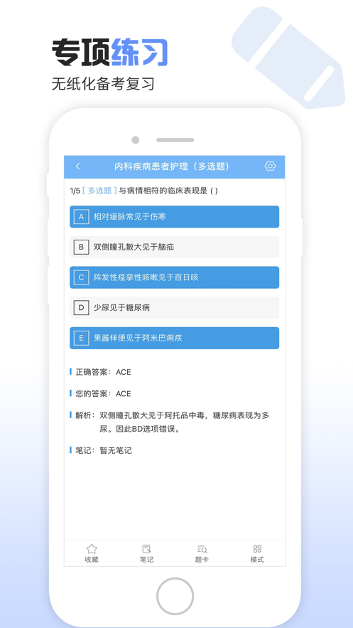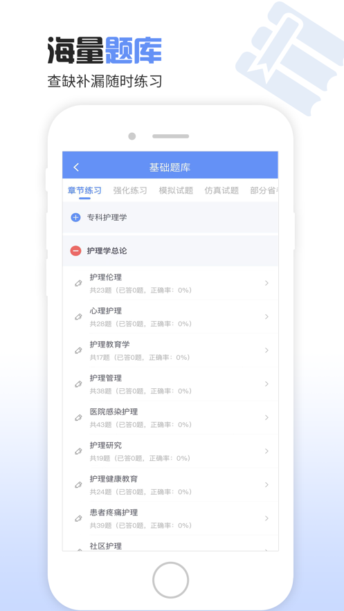 护理自测,丰富试题可在线练习,专业知识学习状况随时查看;