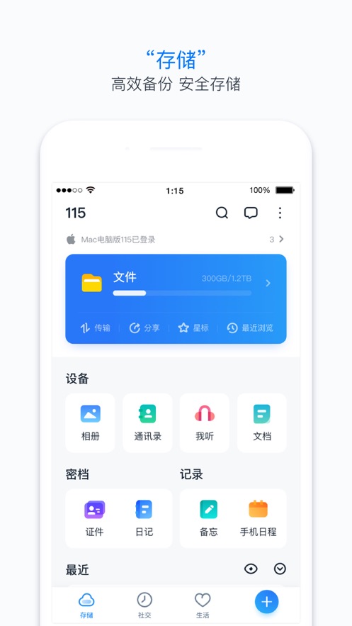 “115”是个人数据中心,致力于为用户提供私有云存储空间,让他们将一生的文件、照片、联系人等移动到云端。