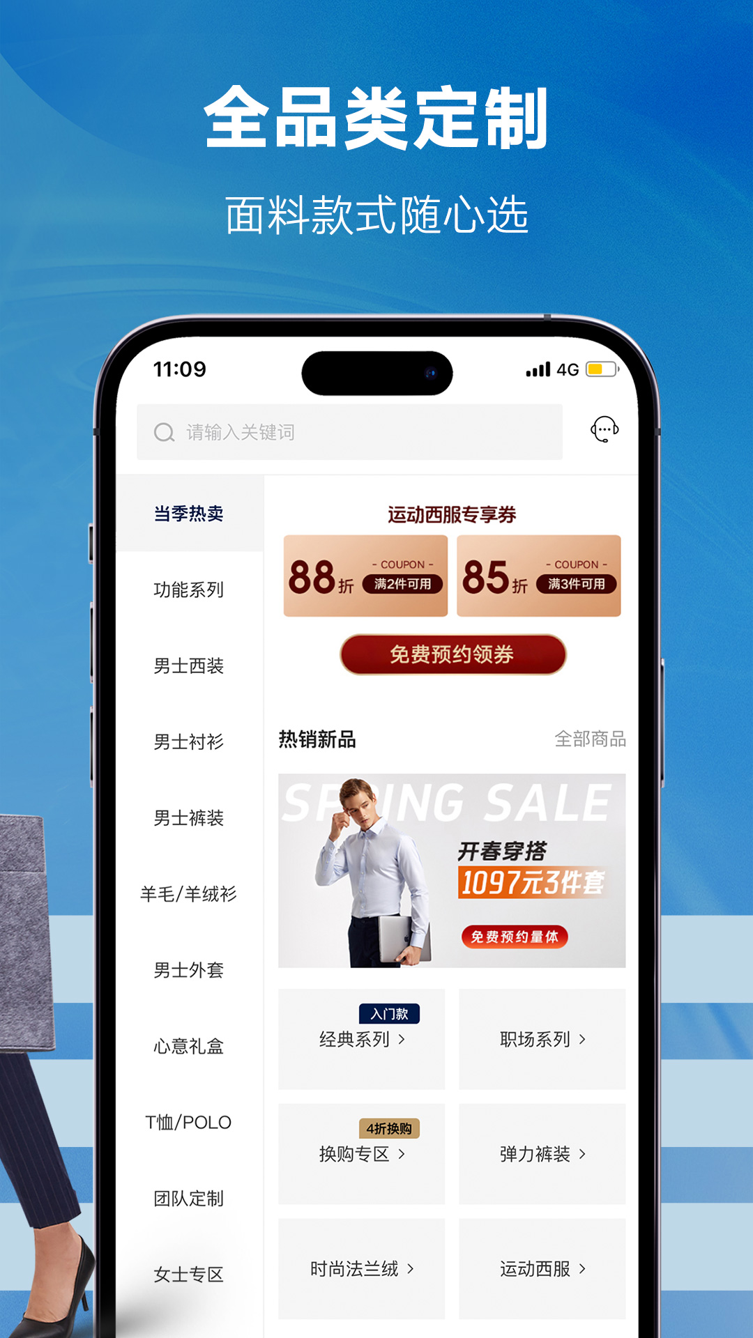 3.在应用程序中浏览面料和款式,选择您喜欢的定制服装。