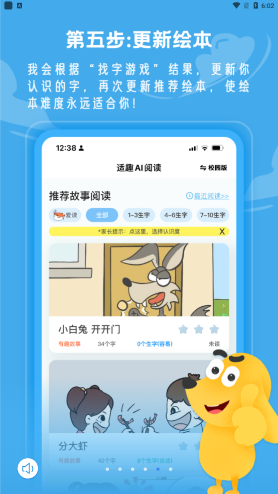 2、产品核心AI技术可实现精准的人物测量,并根据用户的识字能力智能推送合适的绘本。