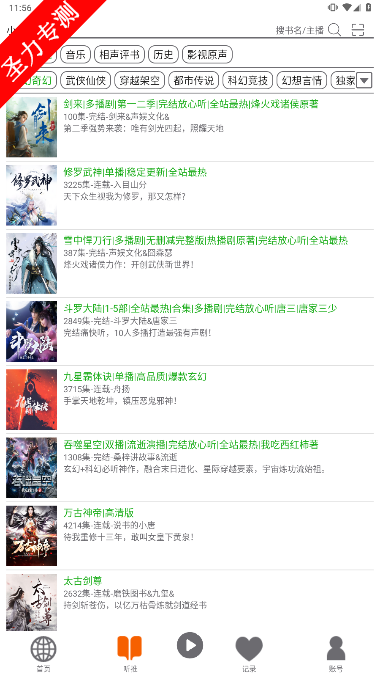 输入软件主页,该页面可能显示诸如电影和电视,音乐,简短戏剧等功能入口。单击下面的“收听书籍”选项以切换到书籍。