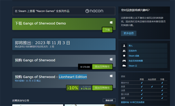 Gangs of Sherwood 将于11 月在Steam 上推出。目前,游戏已经推出试玩版。玩家们可以尝试一下,也可以开始游戏预购活动。想要玩DEMO或者预购的玩家可以在Steam上搜索Gangs of。舍伍德找到了这款游戏。