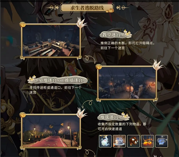 逃生路线:教堂迷宫(推到正确的木板,打开障碍点,前往下一个迷宫)-墓地迷宫或墙壁迷宫(找到传送柜或通道口,前往下一个迷宫)-地毯迷宫(收集特殊物品,然后打开通道)-退出。