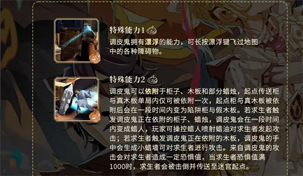 阵营特殊能力-漂浮:顽皮鬼拥有漂浮能力,长按漂浮键即可飞越地图。