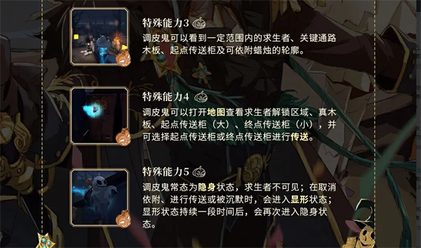阵营特殊能力-透视:顽皮鬼可以看到一定范围内的幸存者、关键通道、木板、起点传送柜和蜡烛的轮廓。
