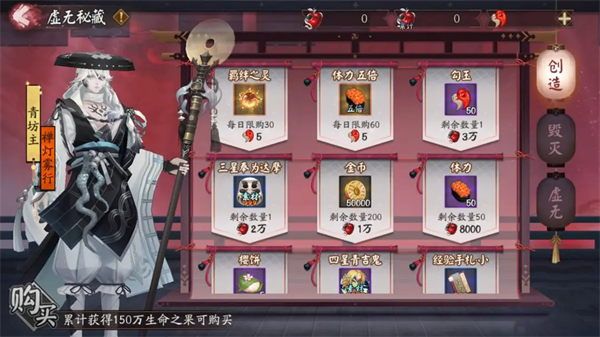 2.玩家可以使用【生命之果】在【虚空秘宝】商店购买体力、金币、达摩等道具。