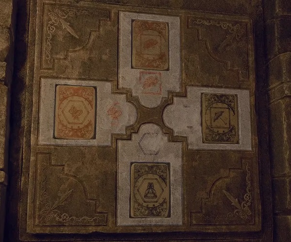 您可以在您身后的墙上,向上、向左、向右的方向看到答案。