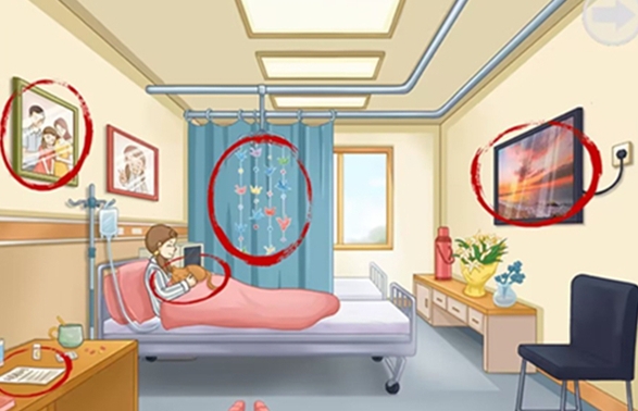 1.首先来到黄色病房。需要点击的项目有电视、合影、小猫、纸鹤、病危通知单;
