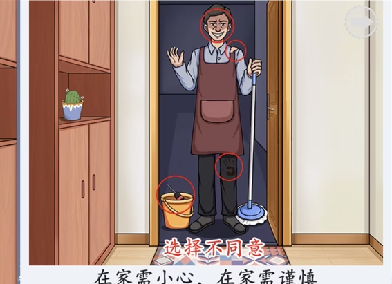 在《脑王》的挨家挨户清洁关卡中,一共回来了三名清洁工。玩家需要根据衣服和携带的清洁用品来识别谁是真正的清洁工。第一个、第三个是假清洁,不要让他们进来,第二个是真清洁。