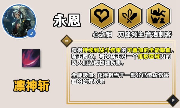 技能:永恩在游戏结束前获得全能的吸血能力,并对前方造成两道斩击。