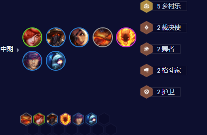 阵容组合: 5 乡村音乐2 裁判2 舞者2 战士2 守卫