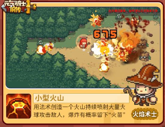烈焰术士创建了一个小前锋火山。小号火山会多次投射火焰对敌人造成伤害,有一定几率留下火焰。