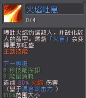 向前喷出火焰燃烧敌人,具有穿甲效果。消耗火焰会增强燃烧效果。