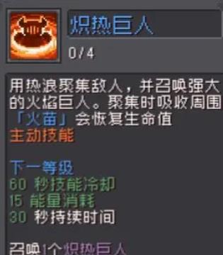利用热浪聚集敌人进行攻击,并用强大的火焰巨人取代冰盾。使用时会吸收周围的火焰并恢复自身的生命值。